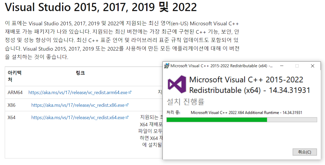 → https://learn.microsoft.com/ko-KR/cpp/windows/latest-supported-vc-redist?view=msvc-170 에서 Visual C++ 설치